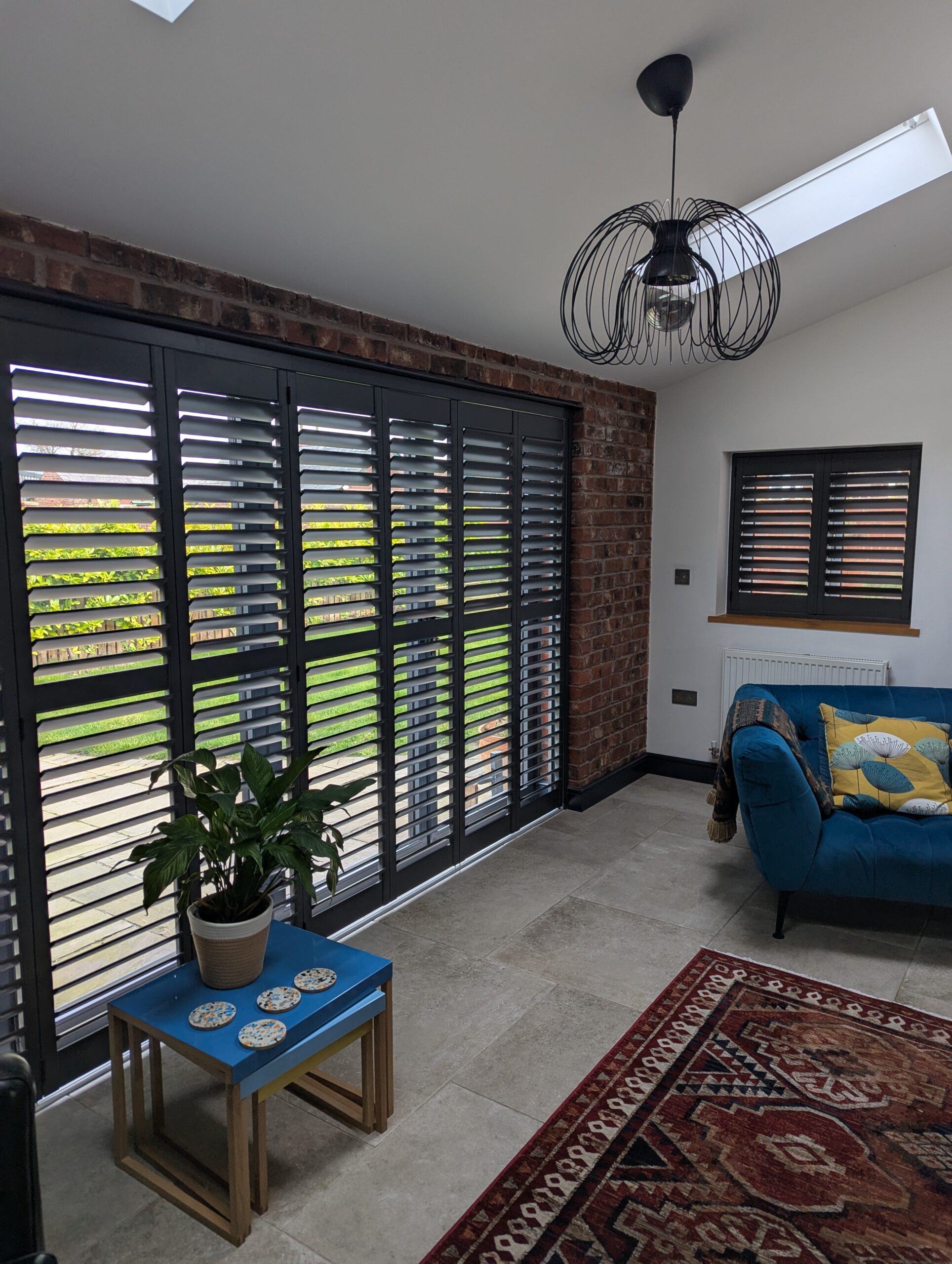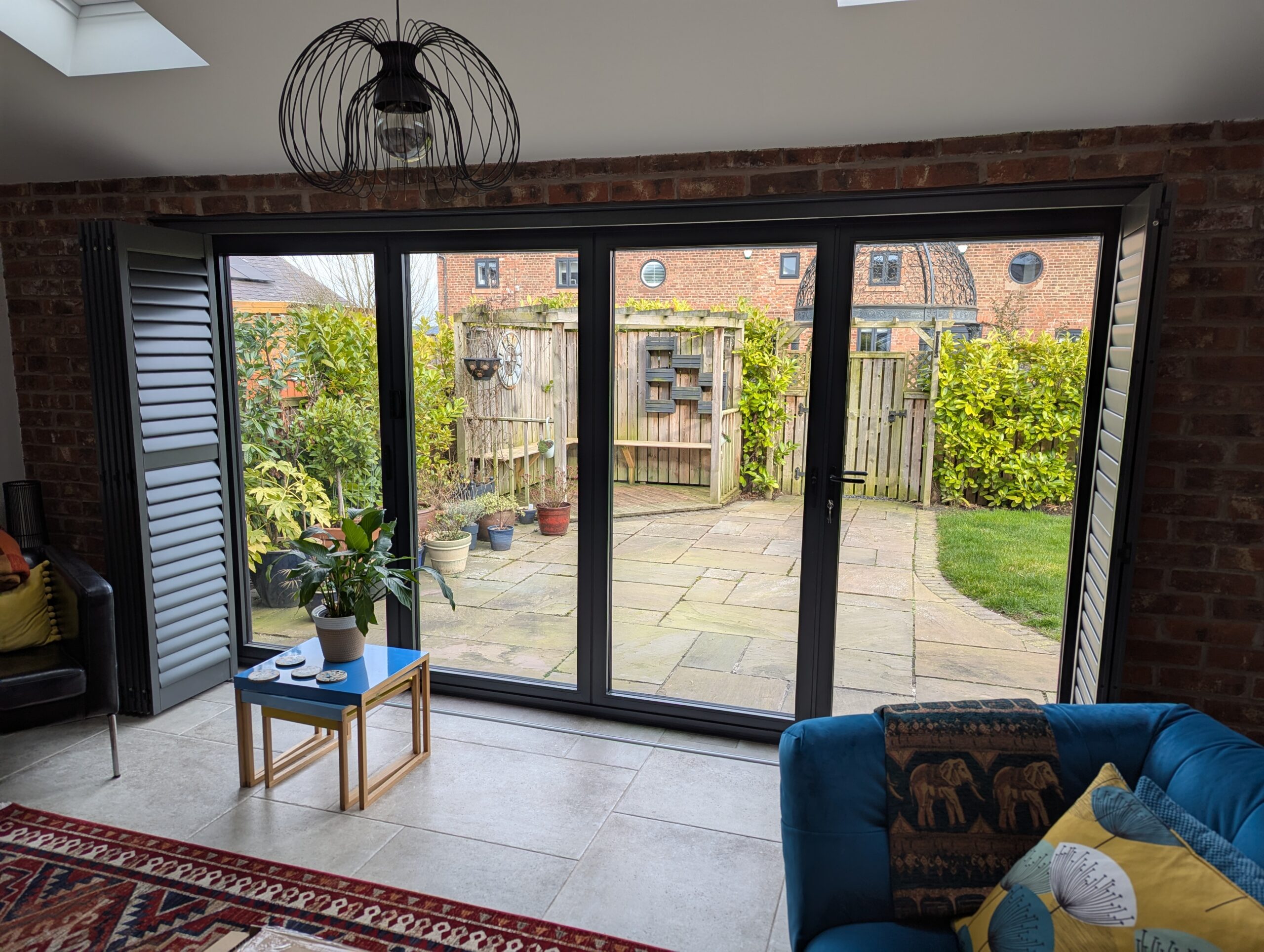 After discussing the options, we recommended a matching anthracite tracked shutter system for both the bi-fold doors and the side window. This allowed the shutters to glide smoothly across the opening, making them ideal for large door spans while still being easy to operate on a day-to-day basis.