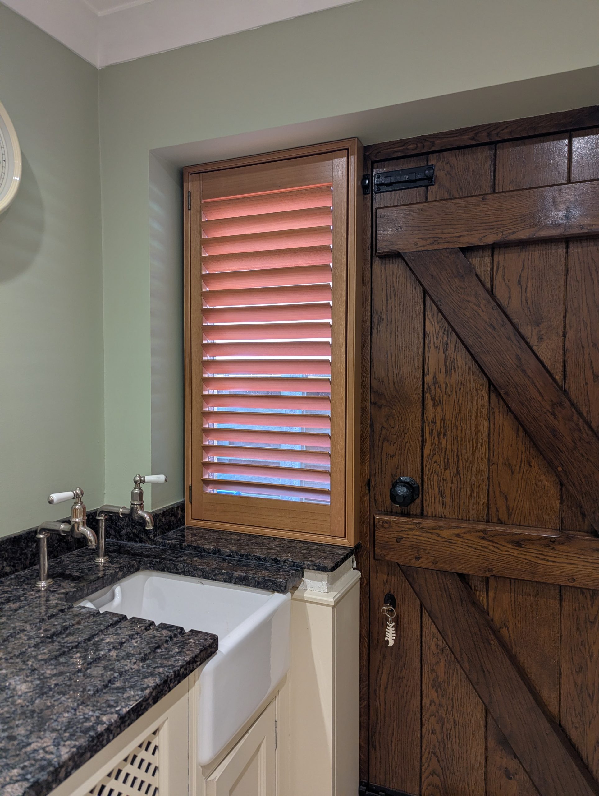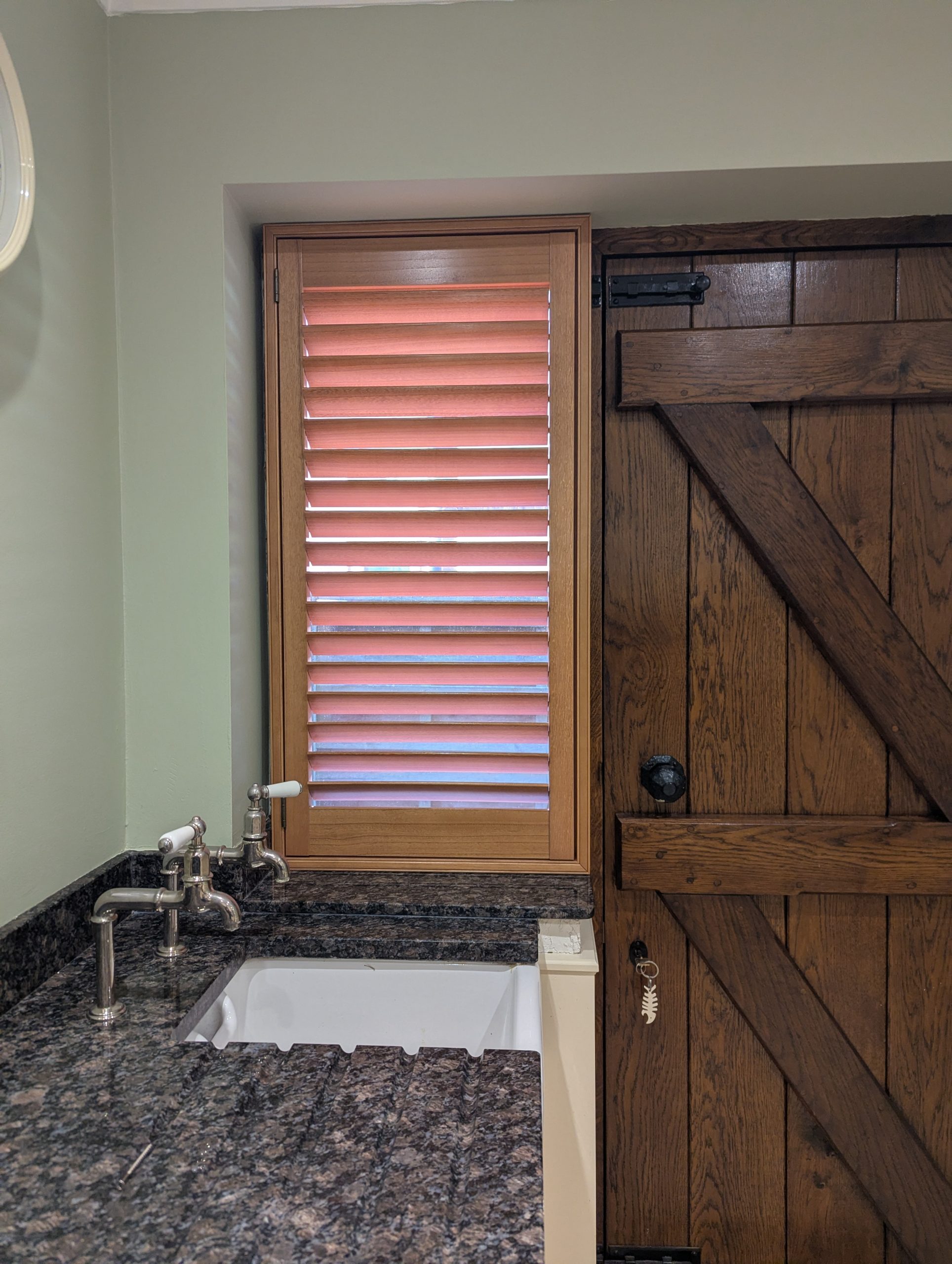 The customer was looking for something that would bring warmth and character into the room while still offering excellent light control and privacy. Oak stain hardwood shutters were the perfect choice. The natural wood grain and rich tones add a real sense of depth that simply cannot be achieved with painted finishes or fabric blinds.